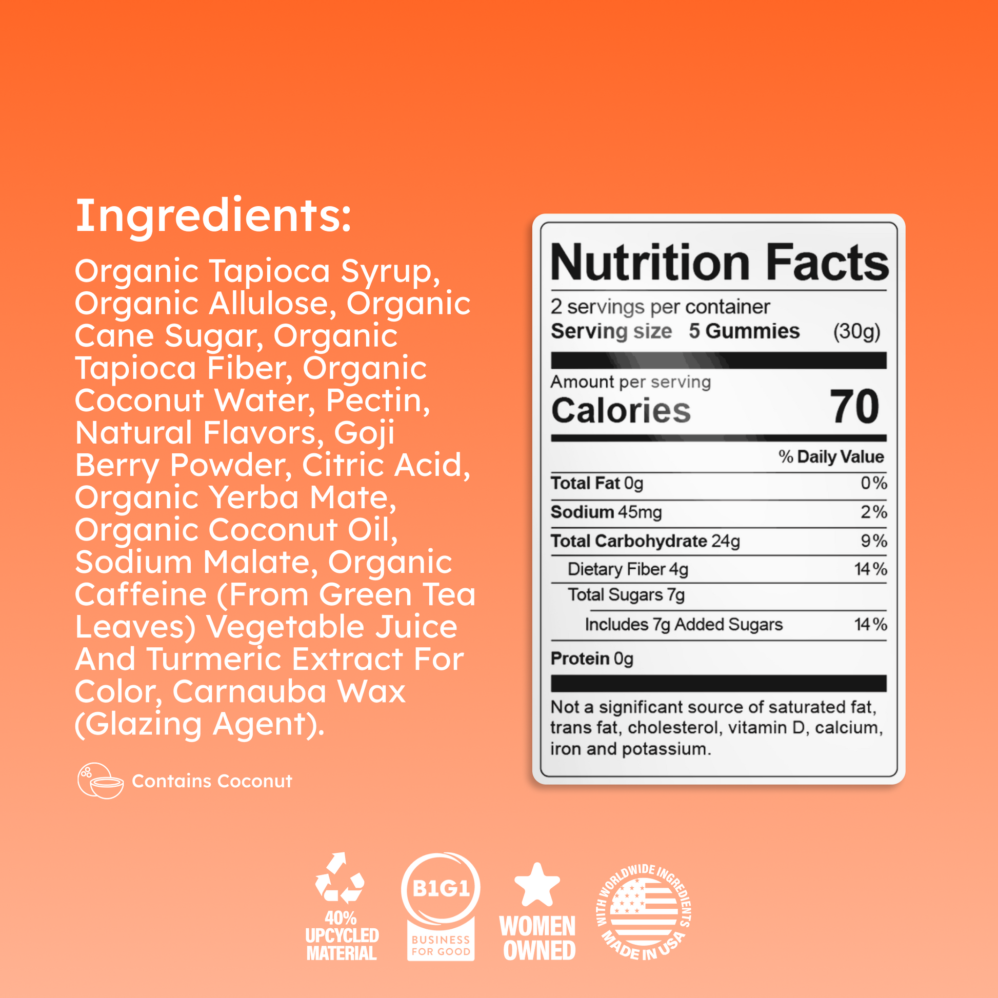 Delicate, floral, and lightly sweet, Orange Blossom Conscious Energy™ gummy snacks offer a unique flavor that’s as refreshing as it is invigorating. Blended with natural caffeine from yerba mate and green tea, these gummy snacks provide a smooth energy boost with every bite. Made with vegan and gluten-free ingredients, they’re the perfect snack for those seeking mindful energy on the go.